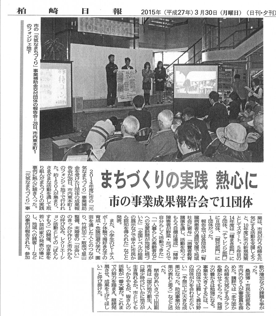 2015年4月28日 | 柏崎市の2014年度「元気なまちづくり」事業助成金を受けた団体の成果報告会が行われ、遊佐理事が昨年8月23日(土)に実施した「第2回ビーチライフin柏崎」について報告を致しました。柏崎日報 |