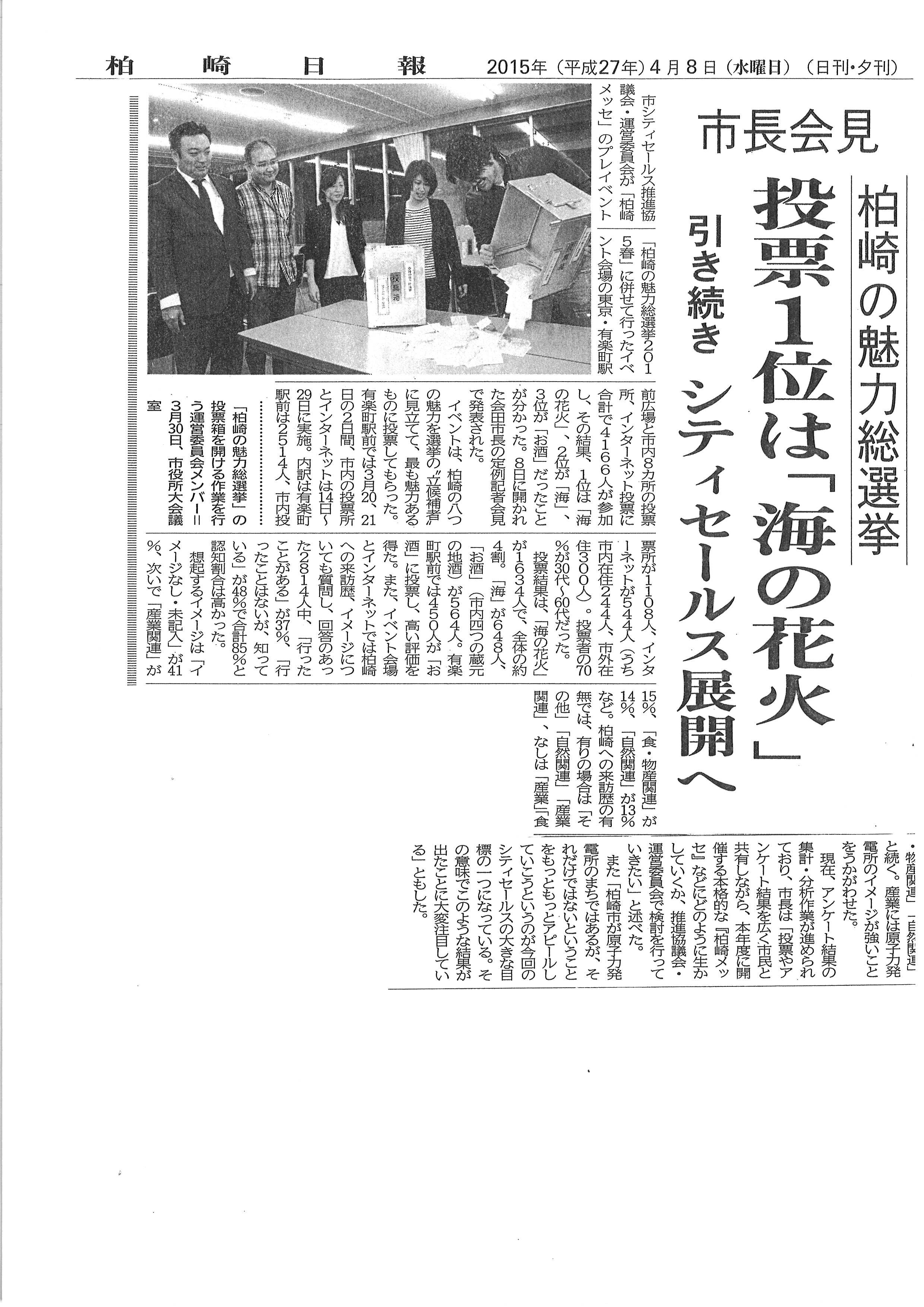 2015年4月27日 | 最も柏崎の魅力のあるものに投票してもらう「柏崎の魅力総選挙」が、3月14日〜29日までインターネットや記述投票が行われ、遊佐理事が「アクティブ日本海!」と柏崎の海岸で楽しめる、レジャーの魅力についてを伝えました。合計4,166人が参加した結果、2位に選ばれました!皆様のご支援、ご協力により、広く柏崎の魅力を伝えることができました。誠にありがとうございました! 柏崎新聞・柏崎日報 |