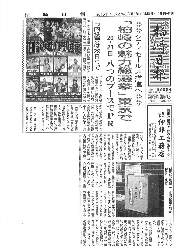 2015年3月16日 | 地元新潟県柏崎市の広報として、活動しております。『柏崎の魅力総選挙2015春』がスタート! 詳しくはこちらから!、ポスター[PDF] |