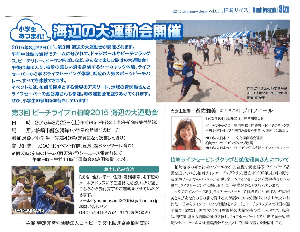 2015年8月7日 | フリーペーパー「柏崎サイズ」に8月22日(土)に開催される「第3回ビーチライフin柏崎」が紹介されました。また、遊佐理事の活動も紹介され、柏崎シティーセールス推進協議会の委員として柏崎の魅力をビーチから発信しています。掲載記事 |