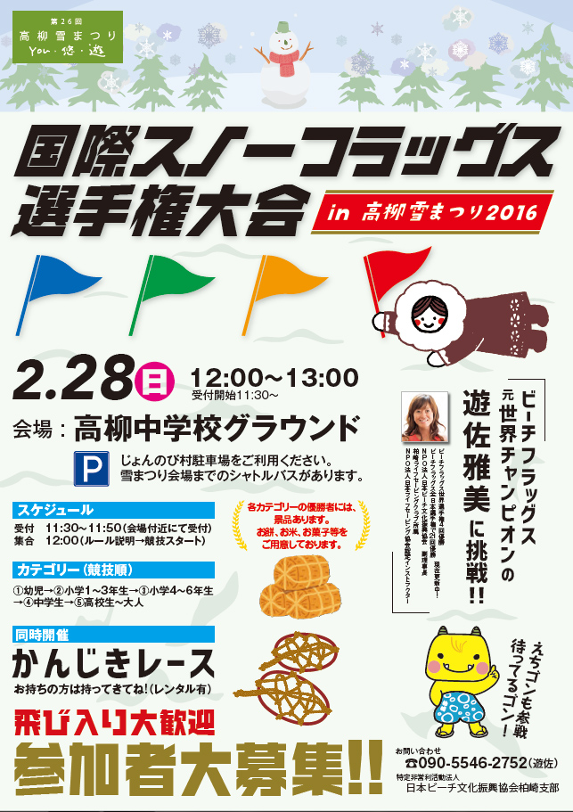 2016年2月12日 | 2月27日(土)、28日(日)に新潟県柏崎市の高柳町で行われる『高柳雪まつり゛YOU・悠・遊゛』イベントで、国際スノーフラッグス選手権大会in高柳2016を開催致します。ビーチで行うビーチフラッグス大会をなんと雪上で行います!柏崎支部長の遊佐雅美も参加します。詳細はこちらから。 ※イベントチラシ |
