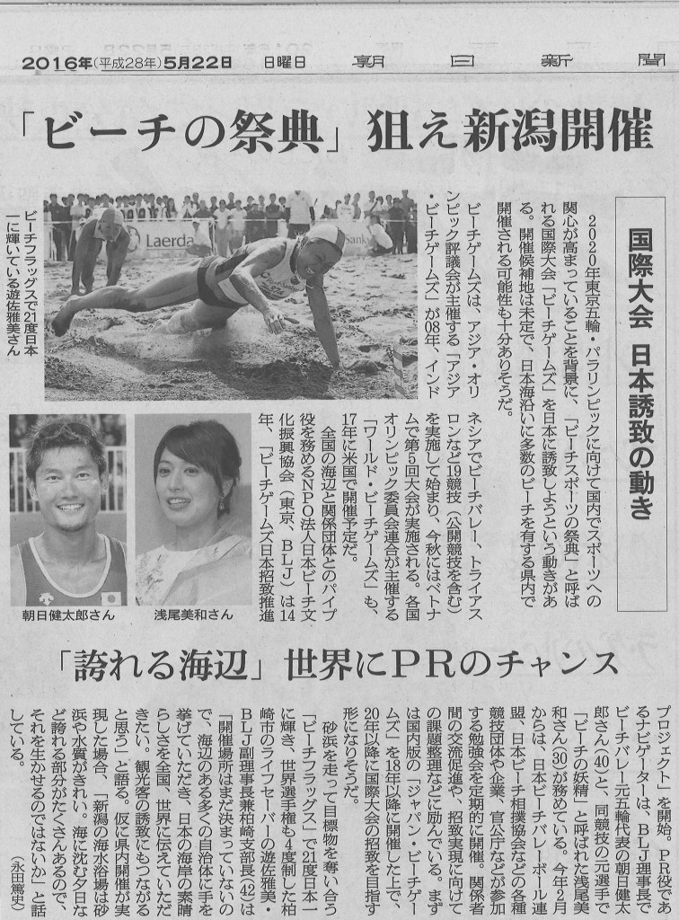 2016年5月25日 | 5月22日(日)の朝日新聞(新潟)に「ビーチゲームズ日本招致推進プロジェクト」の活動が紹介されました。 |