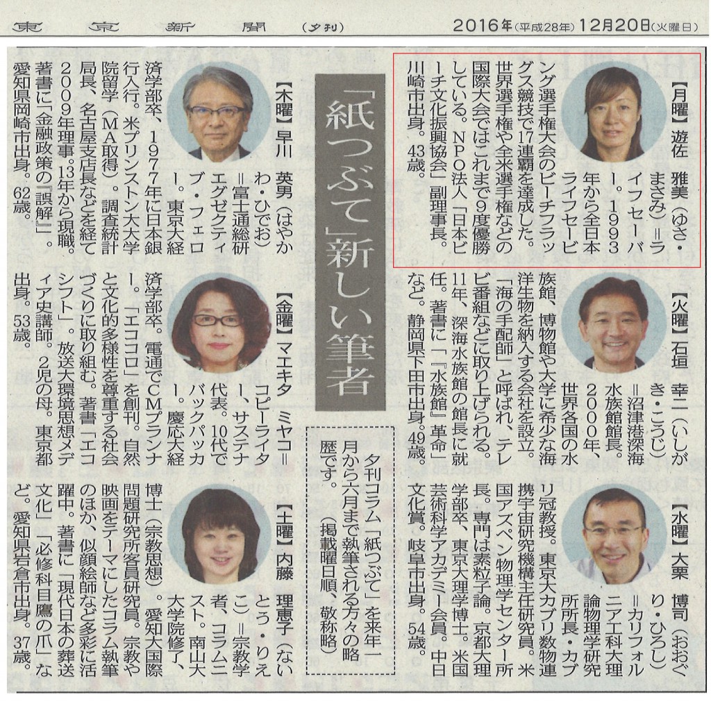 2017年2月8日 | 2月6日(月)東京新聞夕刊の「紙つぶて」に遊佐のコラムが掲載されました。「海水浴場で起きること」というテーマで、迷子の捜索や近年問題となっているゴミの放置などについて綴っています。東京新聞 |
