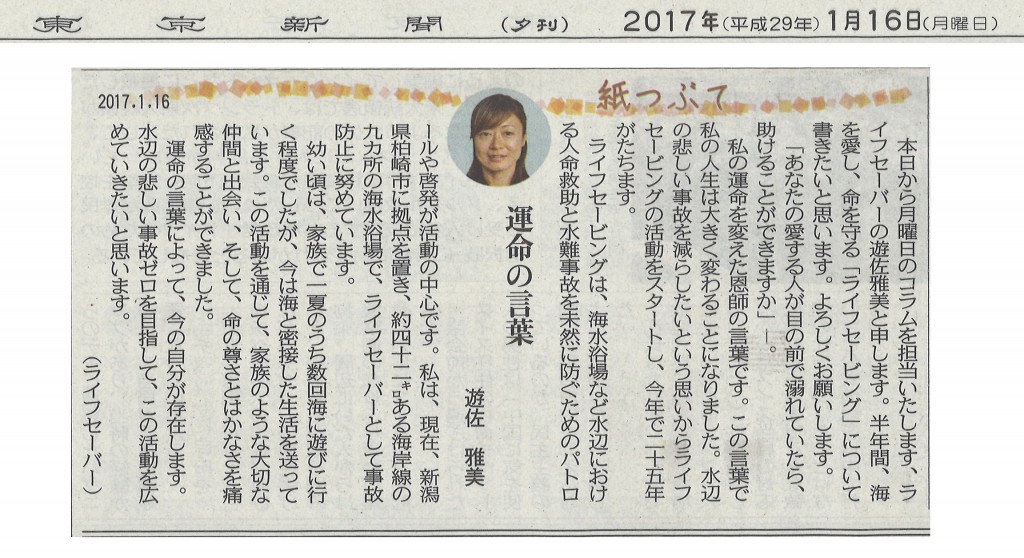 2017年1月23日 | 1月23日(月)東京新聞夕刊の「紙つぶて」にコラムが掲載されました。「ライフセービングの役割」というテーマで、水辺の監視活動について綴っています。東京新聞 |