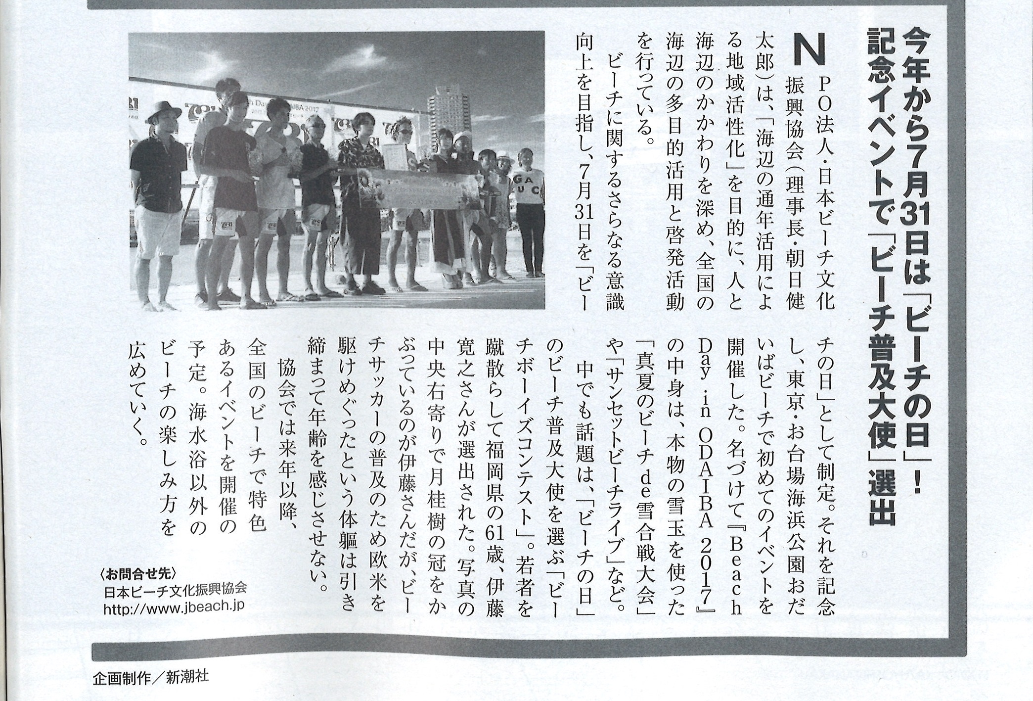 2017年8月31日 | 「週刊新潮秋風月増大号」に、7月31日(月)に行われた「Beach Day in ODAIBA2017」の模様が掲載されました。記事 |