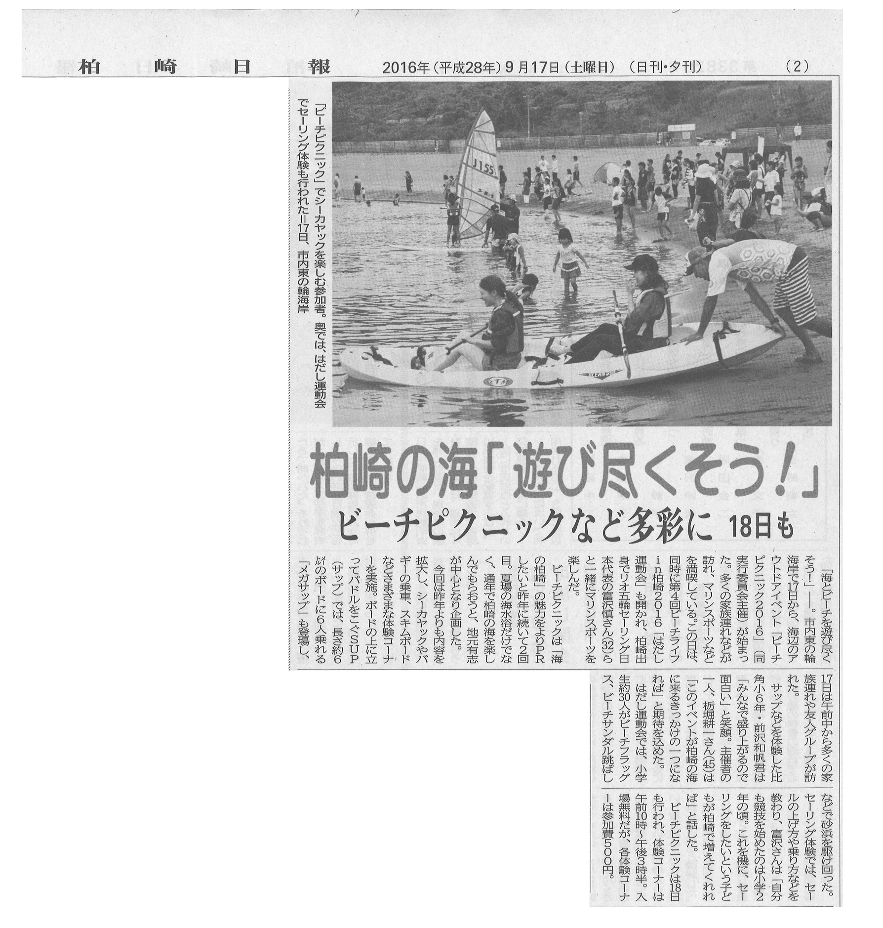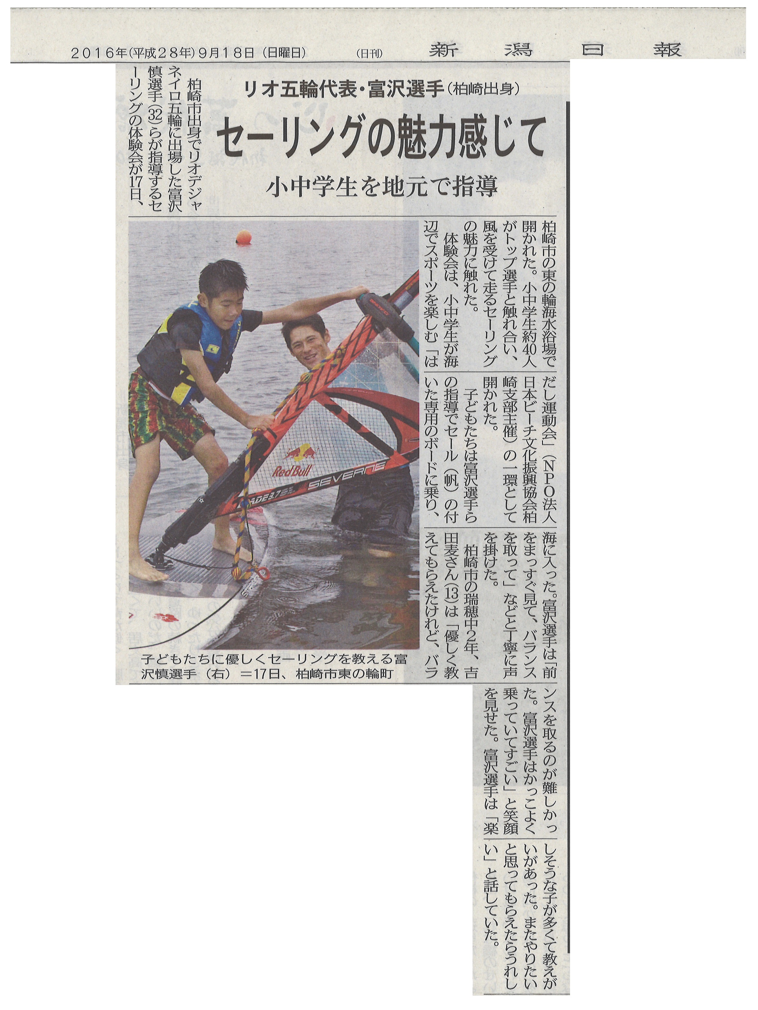2016年9月29日 | 9月17日(土)に開催された『第4回ビーチライフin柏崎』の模様が、新潟日報、柏崎日報に掲載されました。また、リオ五輪に出場した富澤 慎選手が一緒にイベントを盛り上げてくださいました。新潟日報/柏崎日報 |