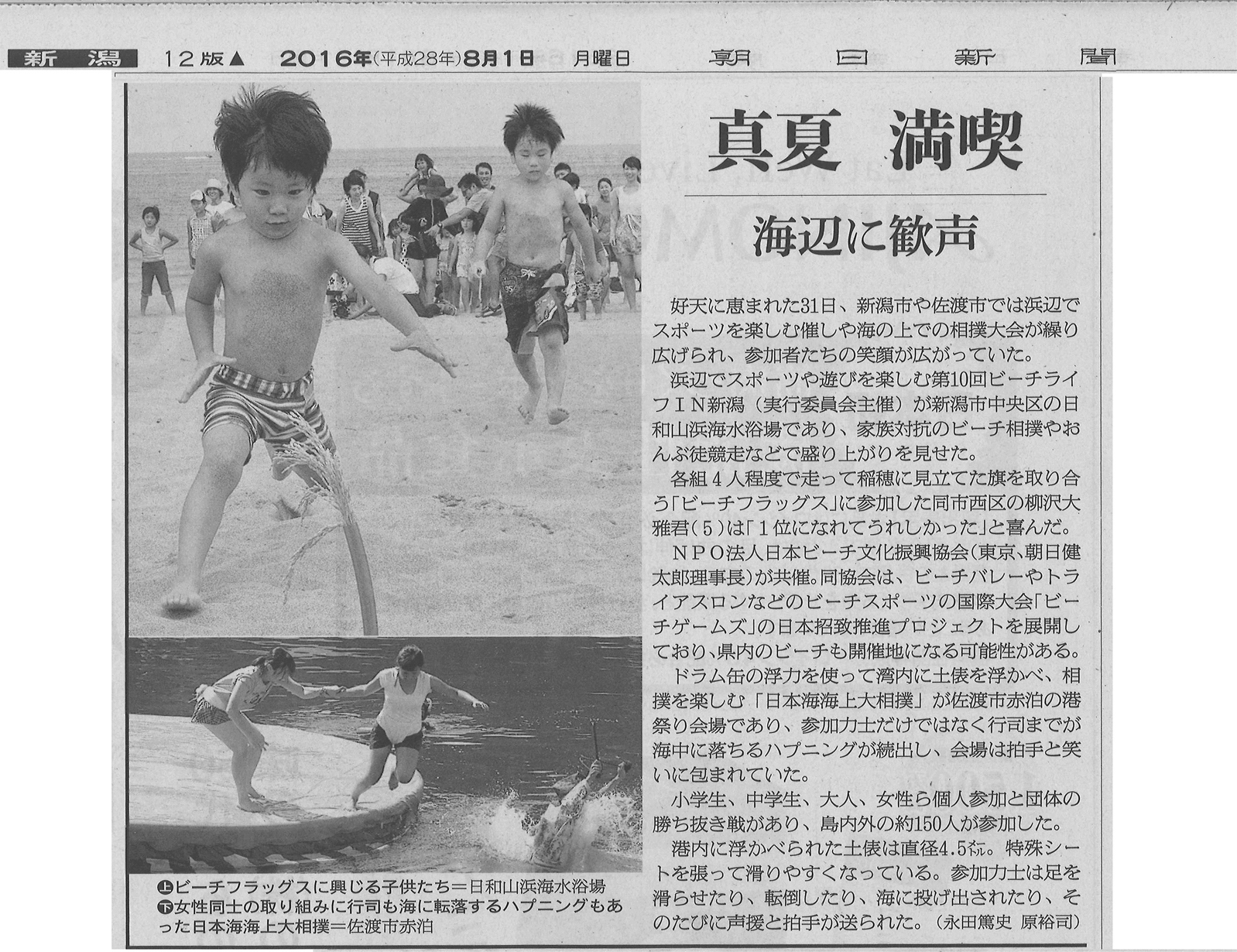 2016年8月3日 | 「第10回ビーチライフIN新潟 家族対抗はだし運動会」の模様が8月1日発行の朝日新聞に掲載されました。掲載記事 |