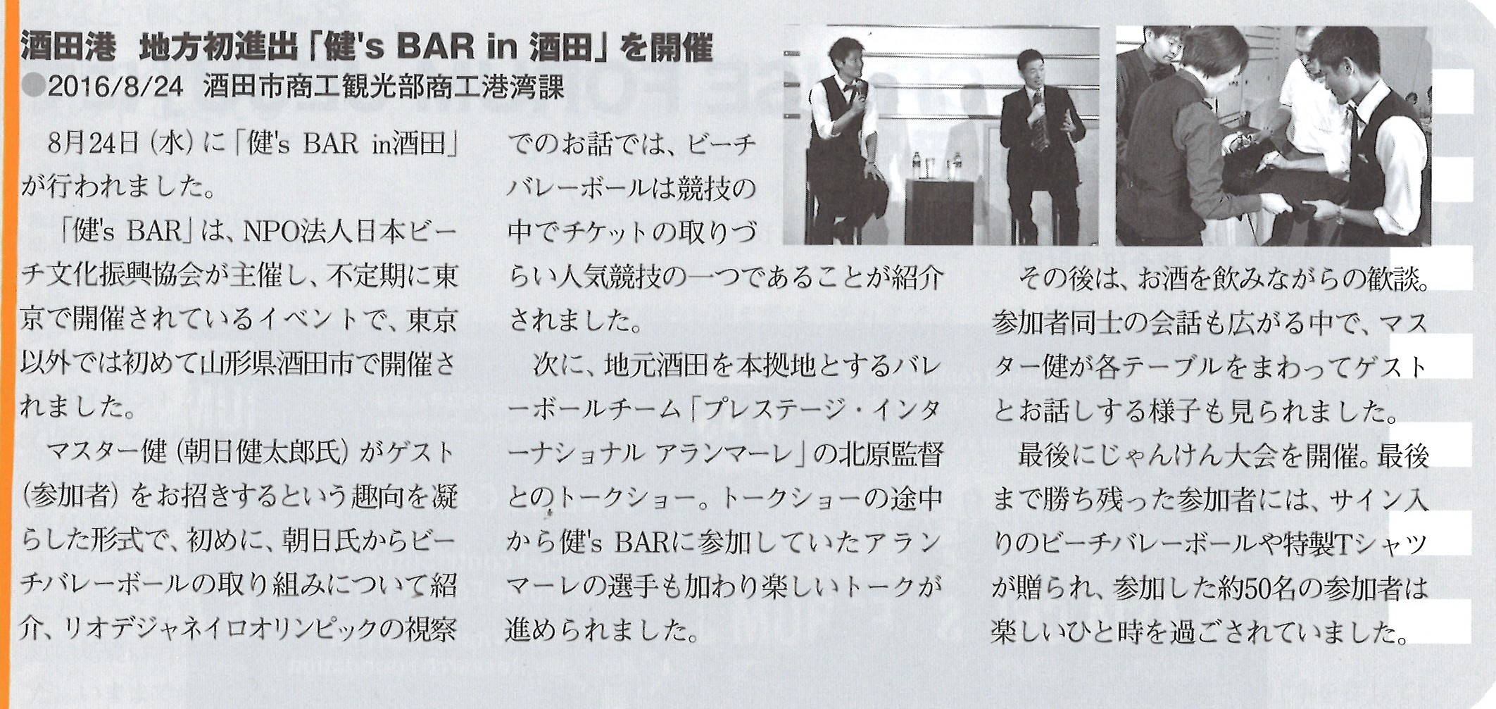 2016年11月7日 | 8月24日に開催された『健'sBARin酒田vol.16』の模様が公益社団法人日本港湾協会発行の『港湾10月号』に掲載されました。プレステージ・インターナショナルアランマーレの北原勉監督とのトークショーが行われました。港湾10月号 |