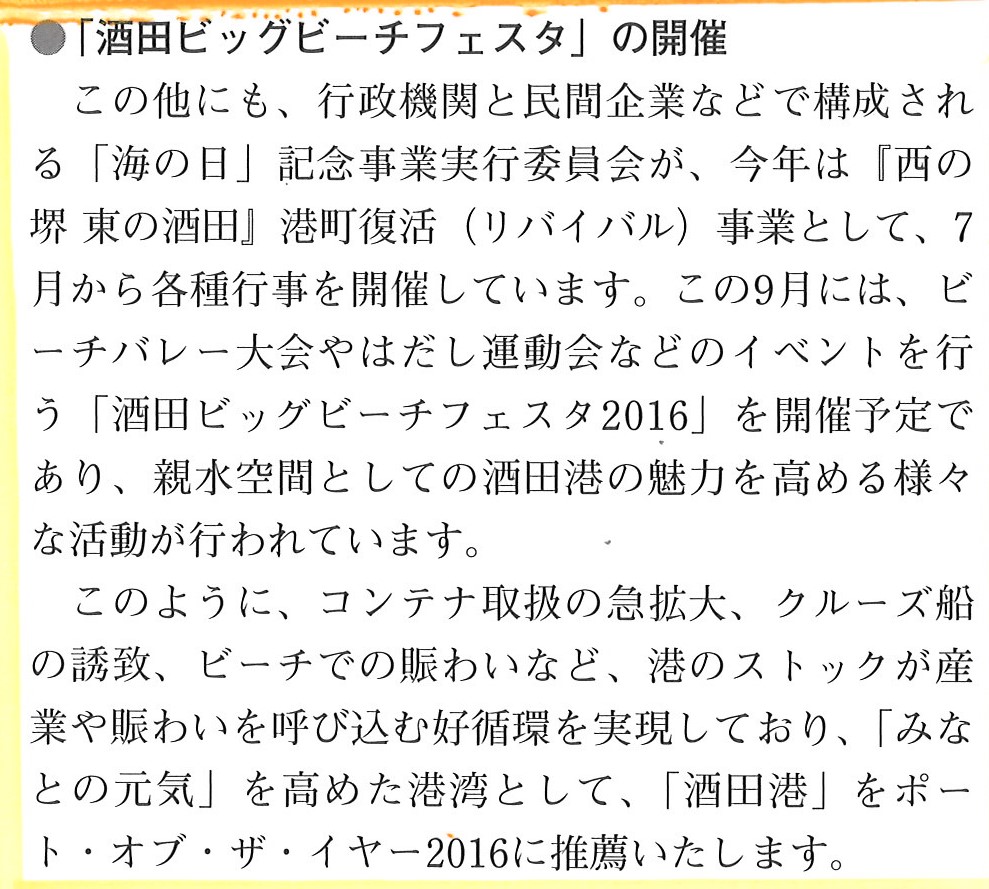 2016年11月8日 | 9月22日に開催された『酒田ビックビーチフェスタ2016』の記事が公益社団法人日本港湾協会発行の『港湾10月号』に掲載されました。PORT OF THE YEAR 2016に「みなとの元気」を高めた港湾として酒田港が推薦されており、その要素の一部として『酒田ビックビーチフェスタ2016』の開催が記載されております。港湾10月号 |