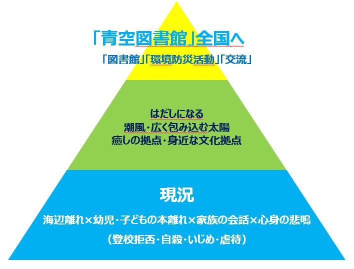 外気に触れる機会を少しでも多くするため、何もすることが無い時にこそ立ち寄れる場所として「青空図書館」はオープンします。子育てに疲れた方、学校に行くのがつらい方、仕事でストレスがいっぱいな方、高齢による孤独など、一日数分でも太陽と風にあたることで心と 身体にビタミンをあたえ、住民の元気に繋がることを目的に活動します。